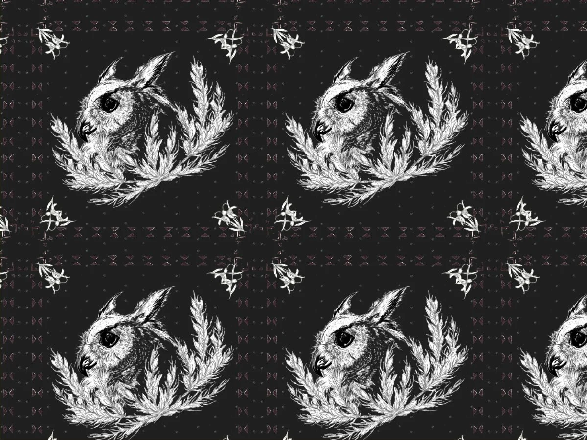 Step into the wild west at night in this free spirit collection. These patterns take the mysterious night sky guarded by the wise owl to new heights. Moody color palette and the soft glow of the stars. Perfect for rich textiles and paper goods.